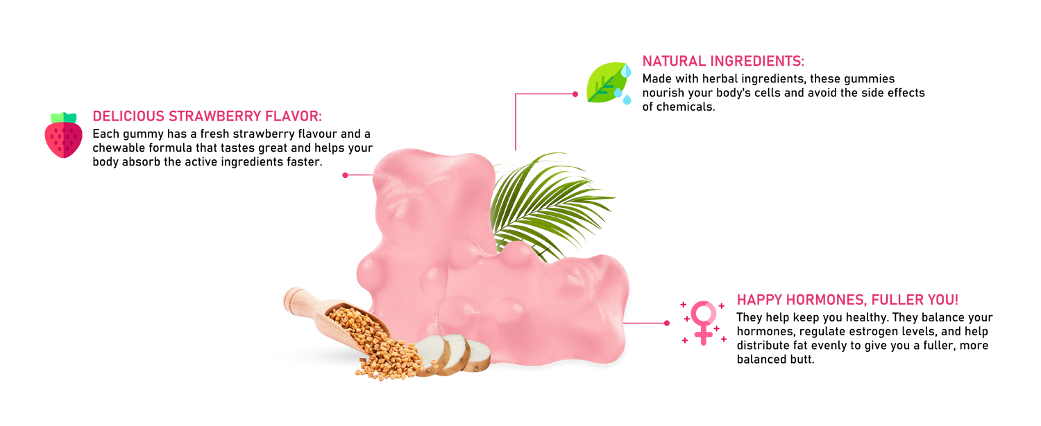 The gummies contain natural ingredients that support muscle growth and fat distribution, enhance skin elasticity, and improve the overall appearance of your buttocks.