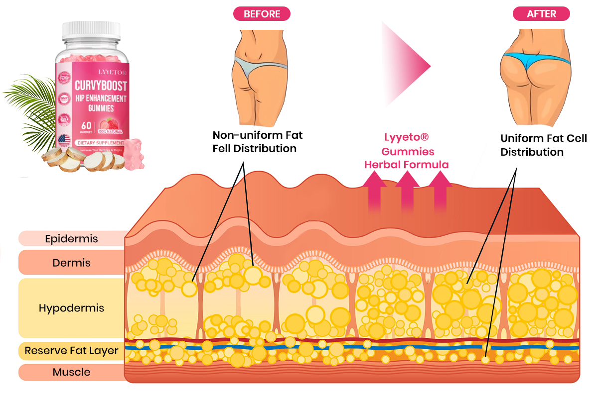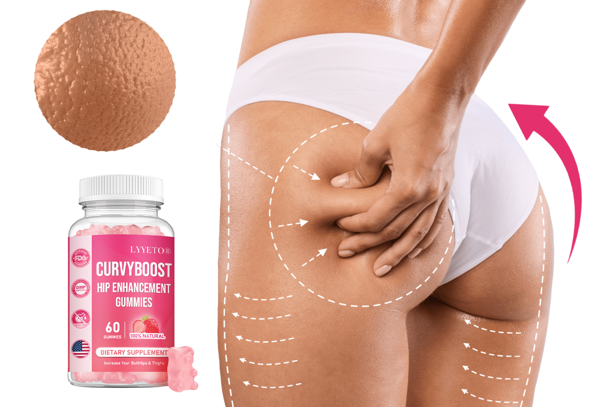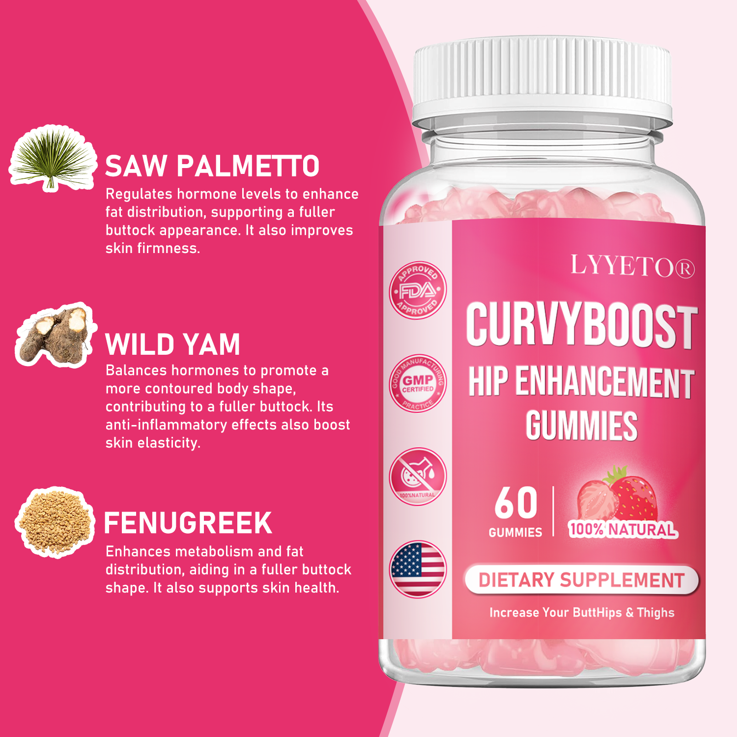 Lyyeto® CurvyBoost Hip Enhancement Gummies are dietary supplements designed to enhance the appearance of your buttocks. They work by promoting muscle growth, improving body composition, and supporting skin health, with natural ingredients rich in plant-based estrogen.